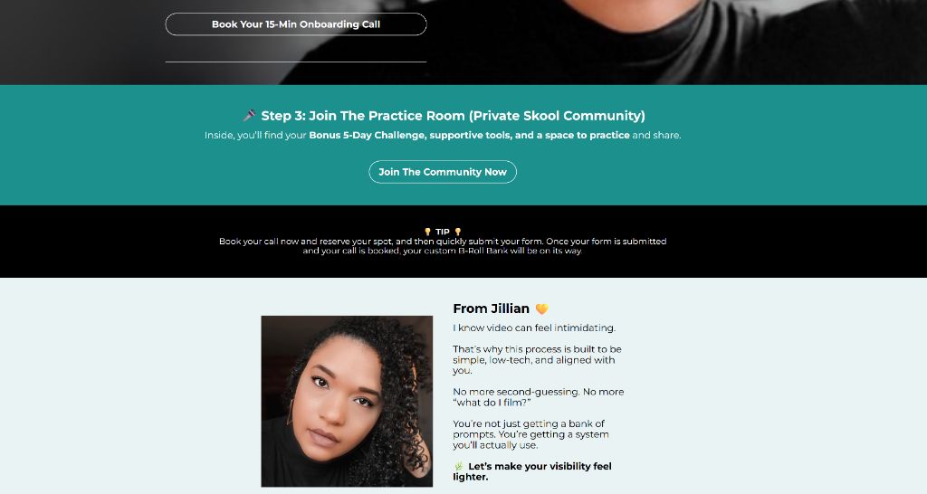 Join The Practice Room Now →Book your call now to reserve an early timeslot, and then submit your form. Remember, we need your form to complete your personalized B-Roll Bank. Once you submit your form, your custom B-Roll Bank will be finalized!